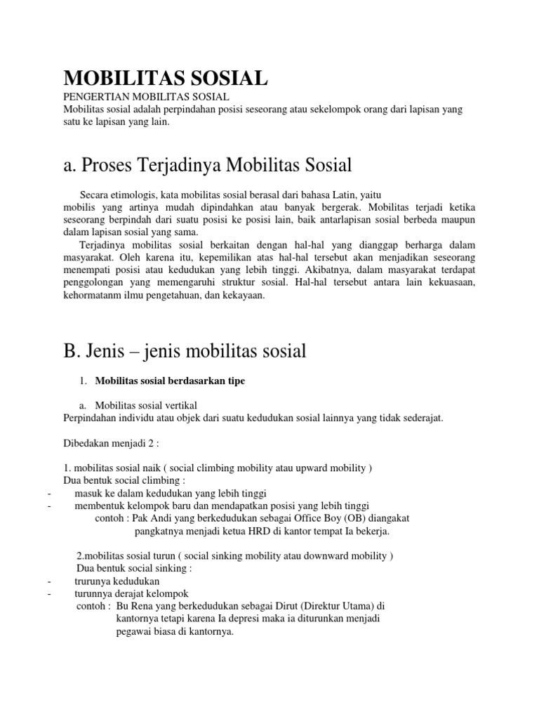 Mobilitas sosial adalah perpindahan posisi atau kedudukan seseorang atau kelompok orang dari satu lapisan ke lapisan lainnya. Misalnya, seorang guru beralih menjadi pemilik toko buku atau seseorang yang pindah temopat kerja karena gaji yang lebih tinggi, maka dirinya melakukan gerak sosial. Terjawab • terverifikasi oleh ahli. Secara etimologis, mobilitas berasal dari bahasa latin mobilis yang berarti mudah dipindahkan dari suatu tempat ke tempat lain. Bentuk mobilitas sosial berdasarkan tipe.