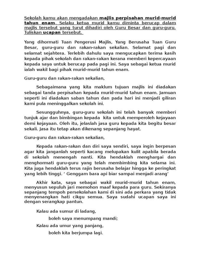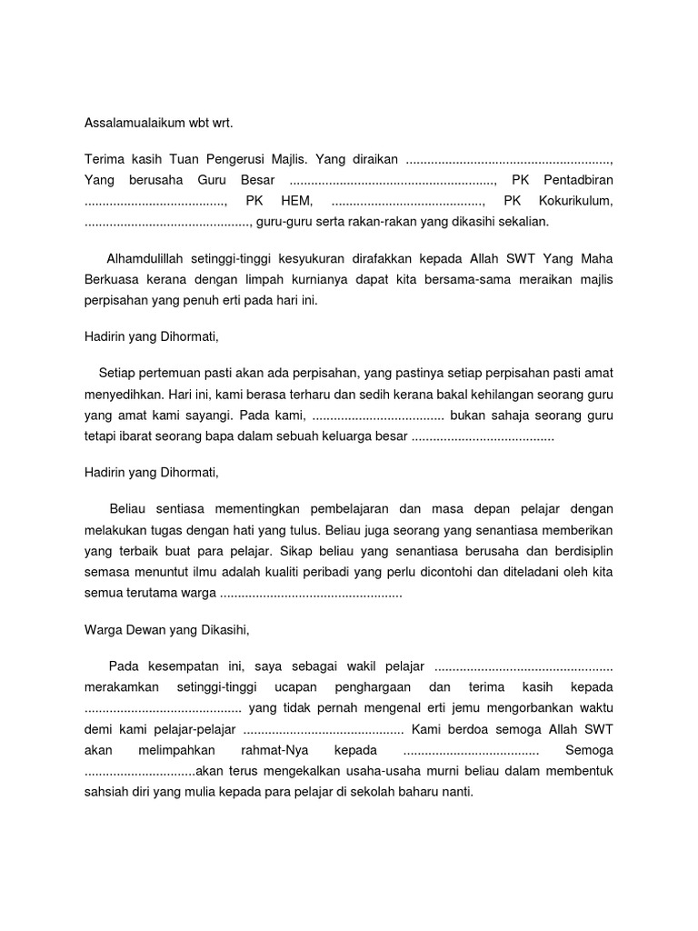 Teks ucapan pengerusi majlis (page 1) teks ucapan ringkas terima kasih teks ucapan perasmian futsal 2011 these pictures of this page are about:teks ucapan pengerusi. Majlis perpisahan persaraan saya dengan rasminya telah dibuat oleh pihak sekolah menengah kebangsaan sultan ibrahin satu, 17000 pasir mas, kelantan pada 28 februari, 2013 ( khamis ), bertempat di dewan besar sekolah yang bermula pada jam 12.00 tengah hari hingga jam 2.00 petang. Ini adalah doa perpisahan majlis yang boleh digunakan dan dibacakan untuk guru, pegawai, kakitangan atau ketua jabatan yang bersara. Disini ada tangisan, ada perjuangan, ada luka, ada tawa, bahagia dan rindu. Teks ucapan ucapan majlis perpisahan persaraan yang yang berusaha dan dihormati 1.